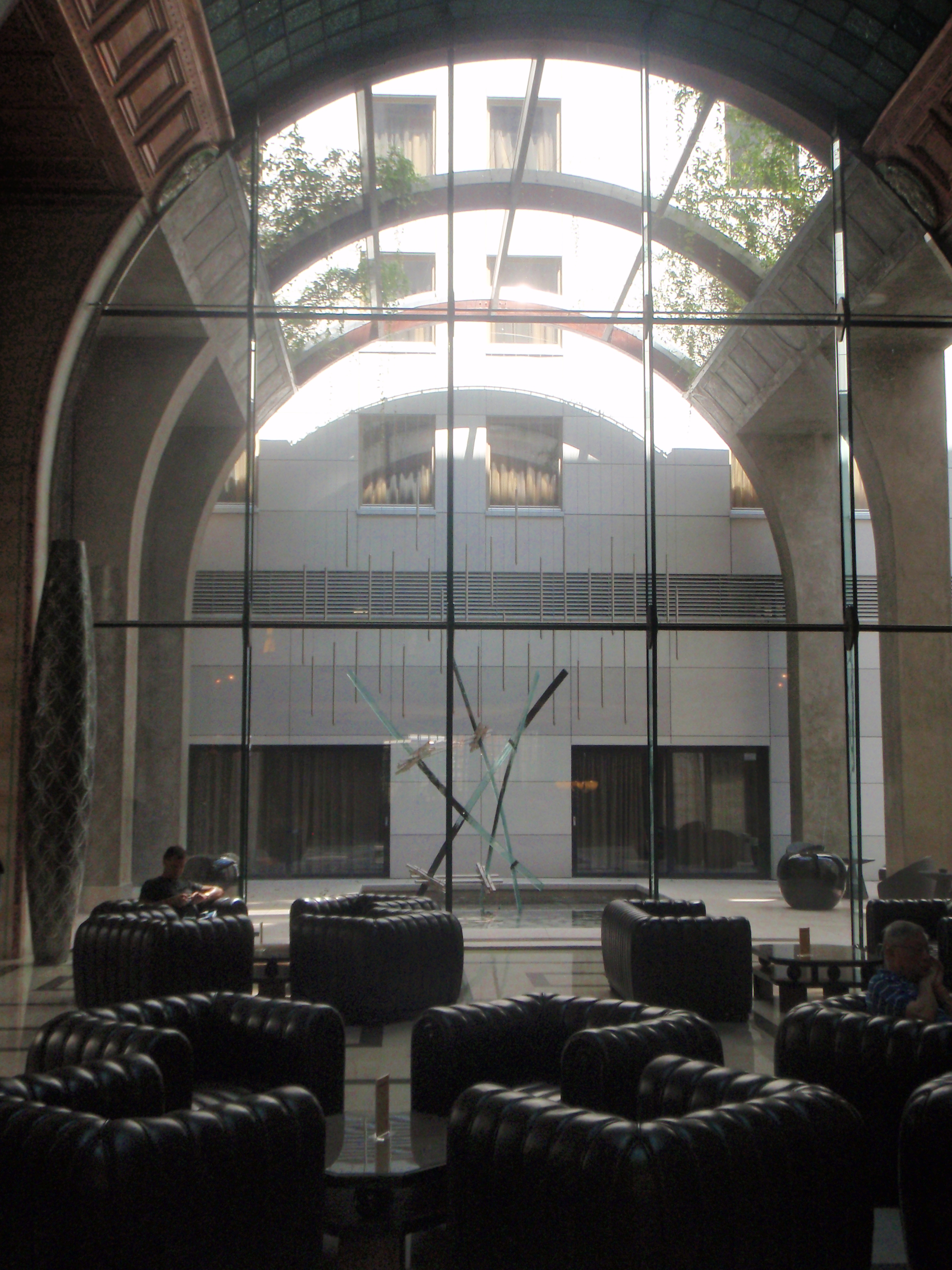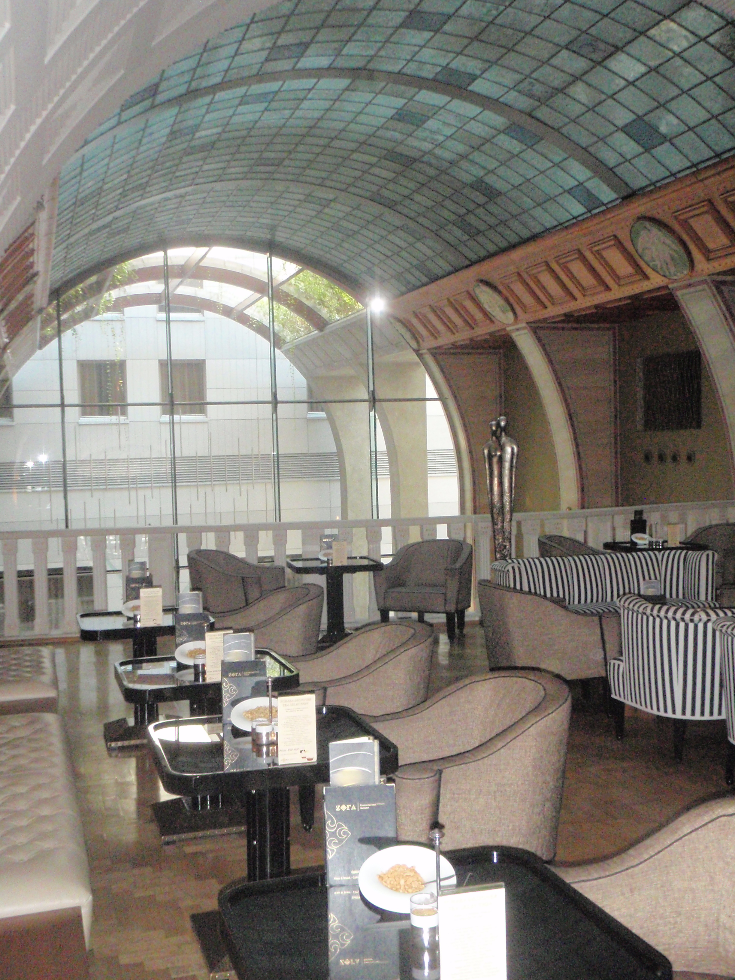 The entrance hall is made of marble in warm shades of red, pinks and oranges with lofty ceilings decorated with Renaissance style frescoes and frieze detailing. There is a galleria bar overlooking this entrance that is delightful. A beautiful water feature and sculpture also adorn the entrance hall, giving it a modern edge.